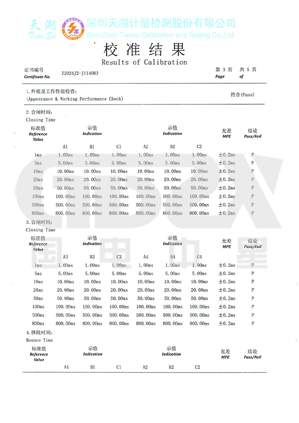 ⑷、可測斷口合、分閘時間、三相不同期、彈跳時間及次數